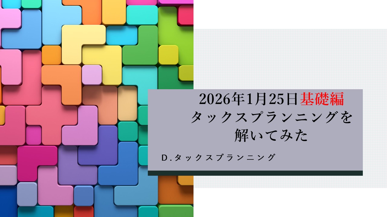 2026年1月25日基礎編相続・事業承継を解いてみた 2026.02.04 F.相続・事業承継 kameno-ongaesi カメのおんがえし 2026年1月25日基礎編不動産を解いてみた 2026.02.03 E.不動産 kameno-ongaesi カメのおんがえし 2026年1月25日基礎編タックスプランニングを解いてみた 2026.02.02 D.タックスプランニング kameno-ongaesi カメのおんがえし 2026年1月25日基礎編金融資産運用を解いてみた 2026.02.01 C.金融資産運用 kameno-ongaesi カメのおんがえし 2026年1月25日基礎編リスク管理を解いてみた 2026.01.31 B.リスク管理 kameno-ongaesi カメのおんがえし 2026年1月25日基礎編ライフプランニングを解いてみた 2026.01.30 A.ライフプランニング kameno-ongaesi カメのおんがえし 2026年1月25日 試験当日持ち込み資料 2026.01.24 0.勉強法 kameno-ongaesi カメのおんがえし 学科試験得点のため、あえて実技試験を見てみるPart1 2026.01.23 F.相続・事業承継 kameno-ongaesi カメのおんがえし 学科試験得点のため、あえて実技試験を見てみるPart2 2026.01.22 E.不動産 kameno-ongaesi カメのおんがえし 2026年1月基礎編攻略 2026.01.20 0.勉強法 kameno-ongaesi カメのおんがえし 模範解答~残り1週間の応用編攻略 2026.01.19 0.勉強法 kameno-ongaesi カメのおんがえし 2026解散総選挙 2026.01.19 X.自由研究 kameno-ongaesi カメのおんがえし 2026年1月試験1週間前 2026.01.17 0.勉強法 kameno-ongaesi カメのおんがえし F.相続・事業承継~試験科目及びその範囲 範囲の細目 2026.01.14 F.相続・事業承継 kameno-ongaesi カメのおんがえし E.不動産~試験科目及びその範囲 範囲の細目 2026.01.11 E.不動産 kameno-ongaesi カメのおんがえし D.タックスプランニング~試験科目及びその範囲 範囲の細目 2026.01.10 D.タックスプランニング kameno-ongaesi カメのおんがえし 債券・国債 過去問 2026.01.09 C.金融資産運用 kameno-ongaesi カメのおんがえし C.金融資産運用~試験科目及びその範囲 範囲の細目 2026.01.07 C.金融資産運用 kameno-ongaesi カメのおんがえし B.リスク管理~試験科目及びその範囲 範囲の細目 2026.01.06 B.リスク管理 kameno-ongaesi カメのおんがえし A.ライフプランニング~試験科目及びその範囲 範囲の細目 2026.01.05 A.ライフプランニング kameno-ongaesi カメのおんがえし 2026年初雪 2026.01.03 X.自由研究 kameno-ongaesi カメのおんがえし 2026年初日の出 2026.01.01 X.自由研究 kameno-ongaesi カメのおんがえし ばけばけ~小泉八雲とせつ展に行っていました 2025.12.29 X.自由研究 kameno-ongaesi カメのおんがえし 幸福度ランキング 2025.12.27 X.自由研究 kameno-ongaesi カメのおんがえし AIバブル? 2025.12.19 X.自由研究 kameno-ongaesi カメのおんがえし 熊 今年の漢字 2025.12.13 X.自由研究 kameno-ongaesi カメのおんがえし インフレ・デフレ 2025.12.06 X.自由研究 kameno-ongaesi カメのおんがえし 続・日本の家計簿 2025.11.21 X.自由研究 kameno-ongaesi カメのおんがえし 食料自給率 2025.11.18 X.自由研究 kameno-ongaesi カメのおんがえし 日本の世界遺産 2025.11.10 X.自由研究 kameno-ongaesi カメのおんがえし もっと見る