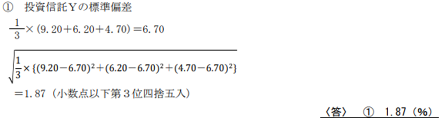 私は①投資信託Yの標準偏差を求めるのに悪戦苦闘して、結局、ギブアップした覚えがあります。模範解答を見て、「なんだ、そういうことだったのか」という思いをしました。
