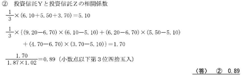 ② 投資信託Yと投資信託Zの相関係数はいくらか。