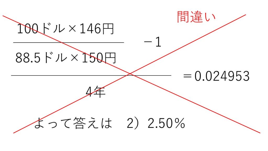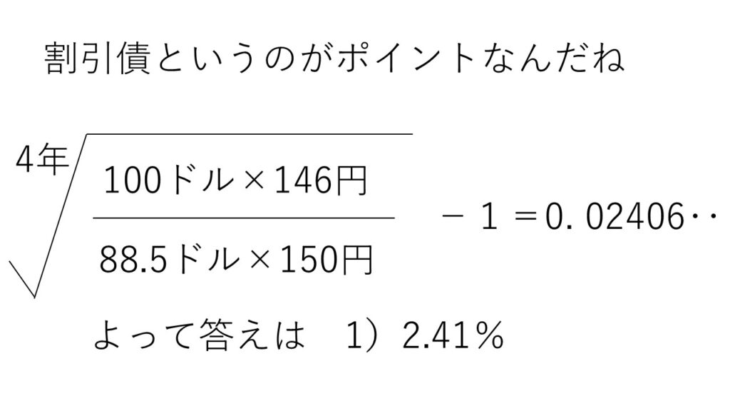 これは間違えた人が結構いるんじゃないかな、問題文の割引債ということに気づいて√ボタンを2回押した記憶のある方は解けたんじゃないかな