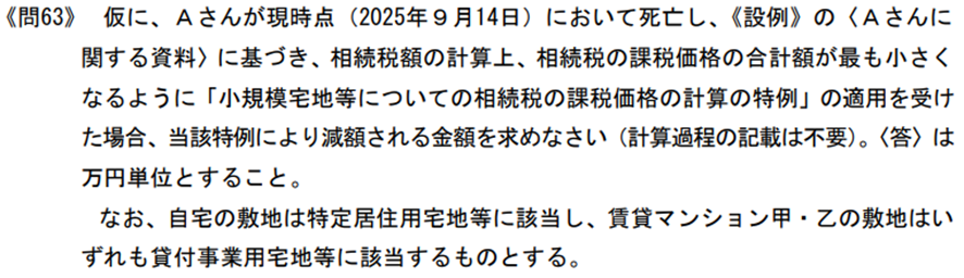 問63は2023年9月試験と同じような内容でしたが、前回は小規模宅地の特例を使える面積が問われていましたが、今回は減額される金額を算定する必要があり、若干、難しくなったと思います。