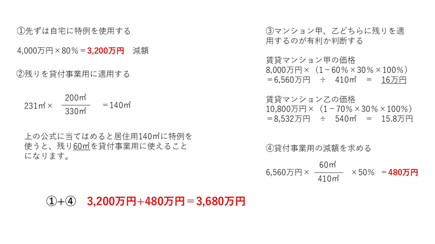 今回のように居住用と貸付事業用を併用する場合以下の公式を頭に入れておかなければなりません。