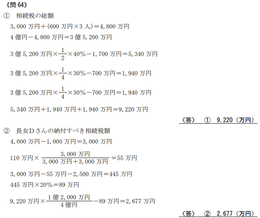 問64相続税の計算問題です。この問題も模範解答を見て納得するのが一番早いと思います。