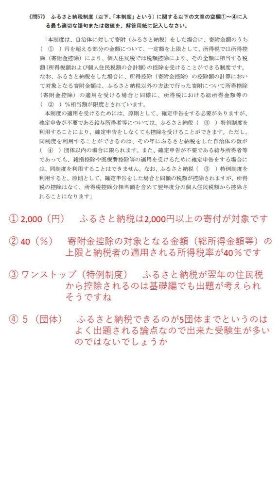 また、設問内の解く順番ですが、先ず問57のふるさと納税の穴埋めから私ならスタートします。